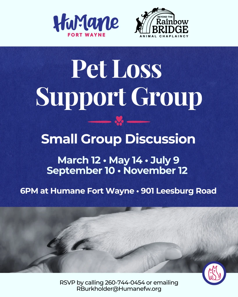 Looking for support after the loss of a beloved pet? Humane Fort Wayne is proud to partner with Beyond the Rainbow Bridge and Dr. Paula Neuman to bring our community a safe and compassionate space to discuss the pet loss and the subsequent grief it creates in our lives. Join us for small group grief support with guided discussions on March 12th at 6PM at 901 Leesburg Road.